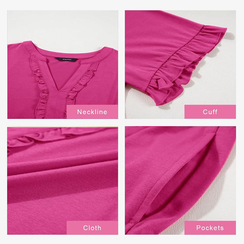 DETALII CHARMING RUFFLE: Volanele subtile la decolteul în V și la tiv adaugă o notă feminină și sporesc eleganța rochiei. Face o declarație fără a fi exagerată.