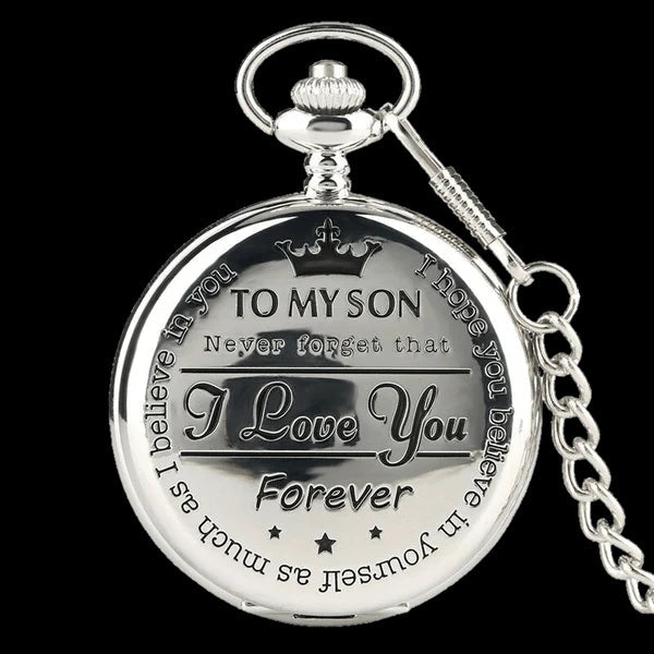 Amintiți-i fiului dvs. cât de mult îl iubiți cu acest frumos ceas de buzunar gravat cu laser. Acest ceas de buzunar este cadoul perfect pe care îl va aprecia și prețui cu adevărat. El va purta dragostea ta cu el pentru totdeauna cu acest memento gravat grijuliu…