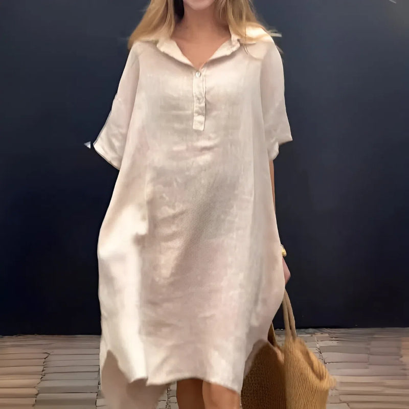 COMFORTABLE OVERSIZED FIT- Concepută pentru confort suprem, această rochie oferă o siluetă relaxată care se desfășoară elegant pe corp, permițând o ușurință de mișcare și un vibe relaxat.