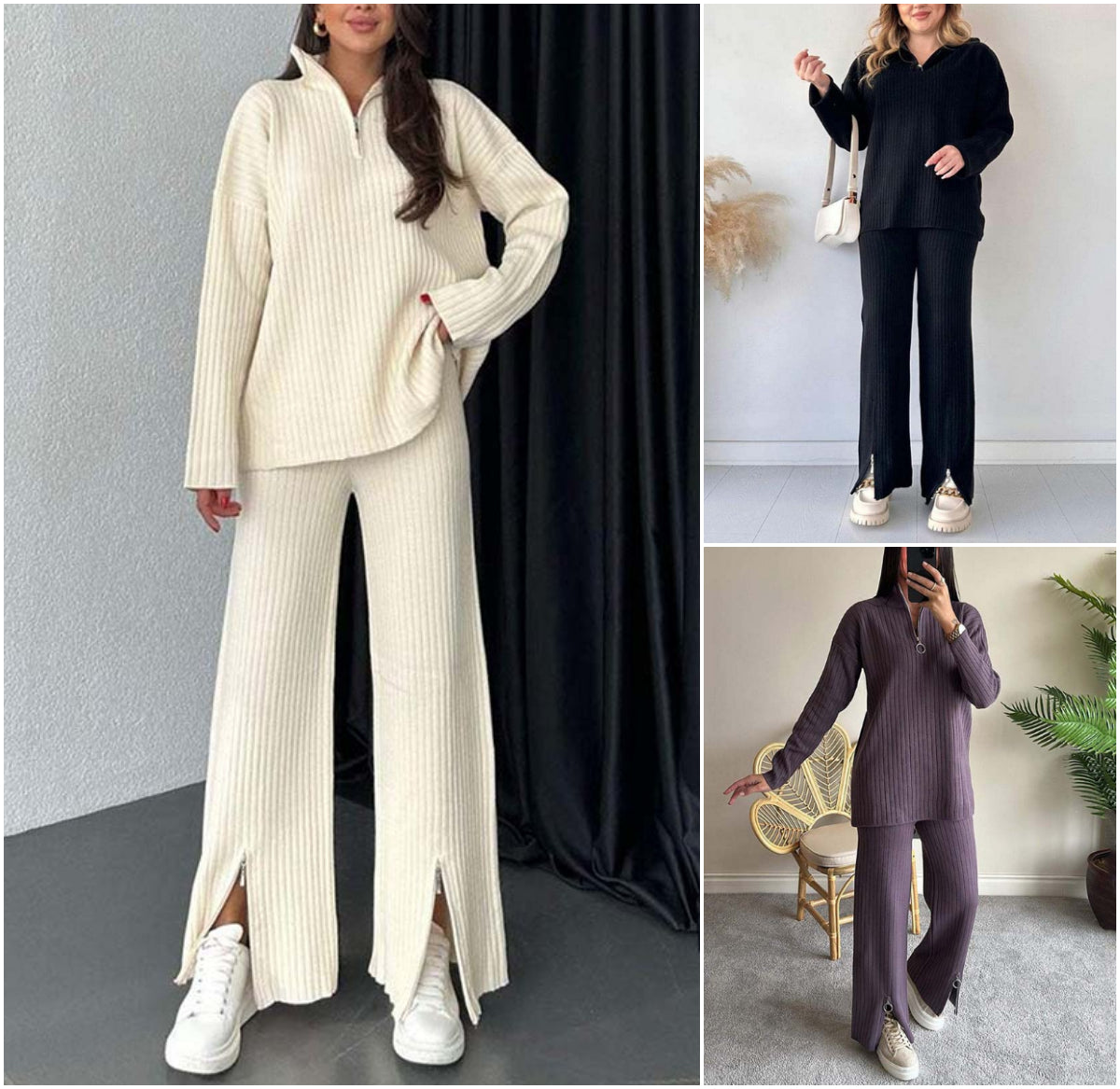 CONFORTUL ÎNTÂLNEȘTE STILUL: Acest set din două piese are un pulover din tricot cu nervuri, cu croială lejeră, cu o jumătate de fermoar în față, perfect pentru suprapunere sau purtat singur. Designul confortabil și relaxat îl face ideal pentru ieșiri ocazionale sau relaxare acasă, în timp ce arată șic fără efort.