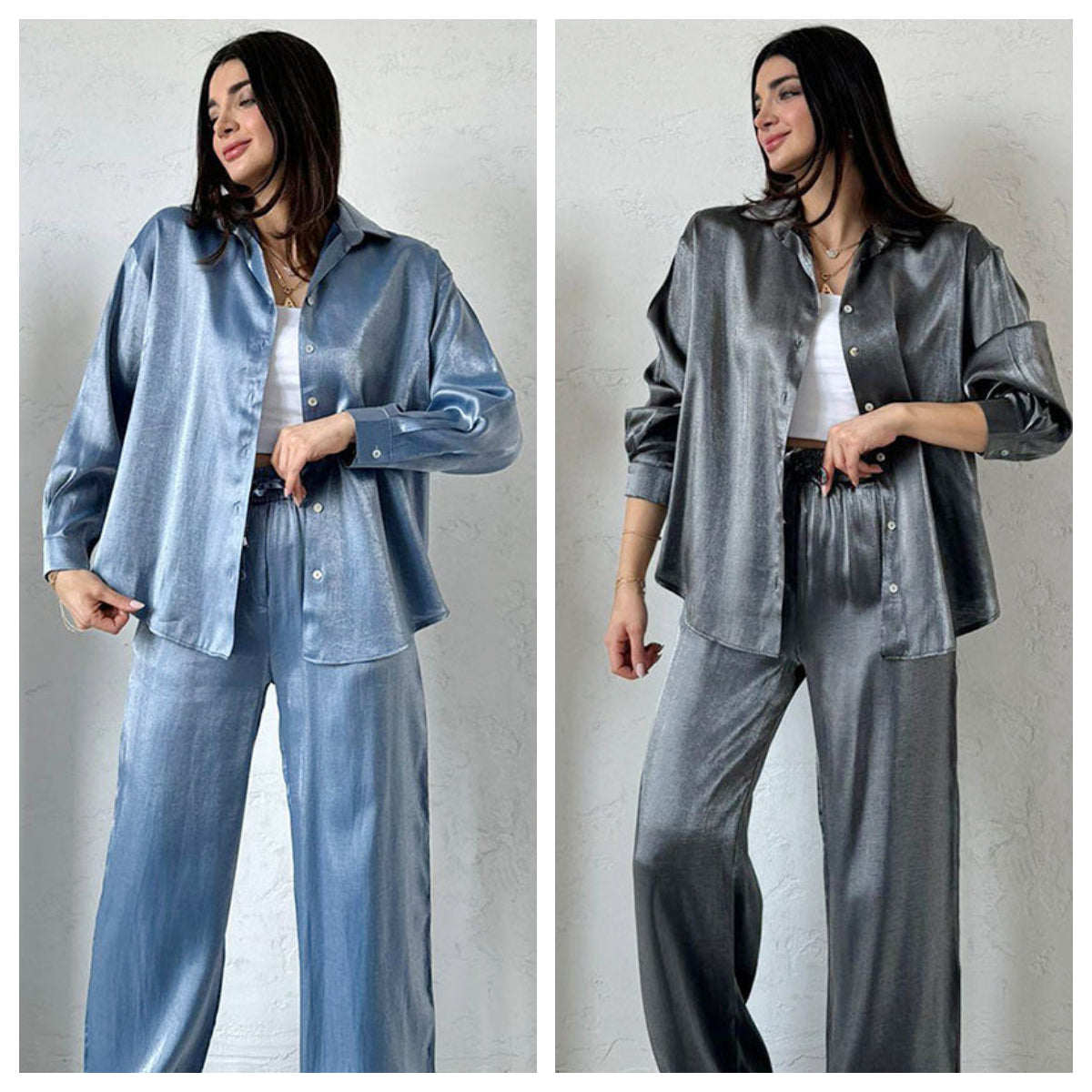 Ținută la modă din 2 piese cu cămașă strălucitoare și pantaloni largi cu talie înaltă