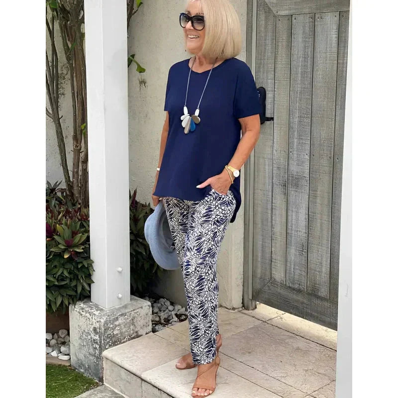 VERSATILITATE ȘI STYLISH: Acest set din două piese nu este doar practic, ci și elegant. Topul simplu combinat cu pantalonii cu un model complicat creează un aspect șic și la modă, care este perfect pentru ținute elegante sau casual.