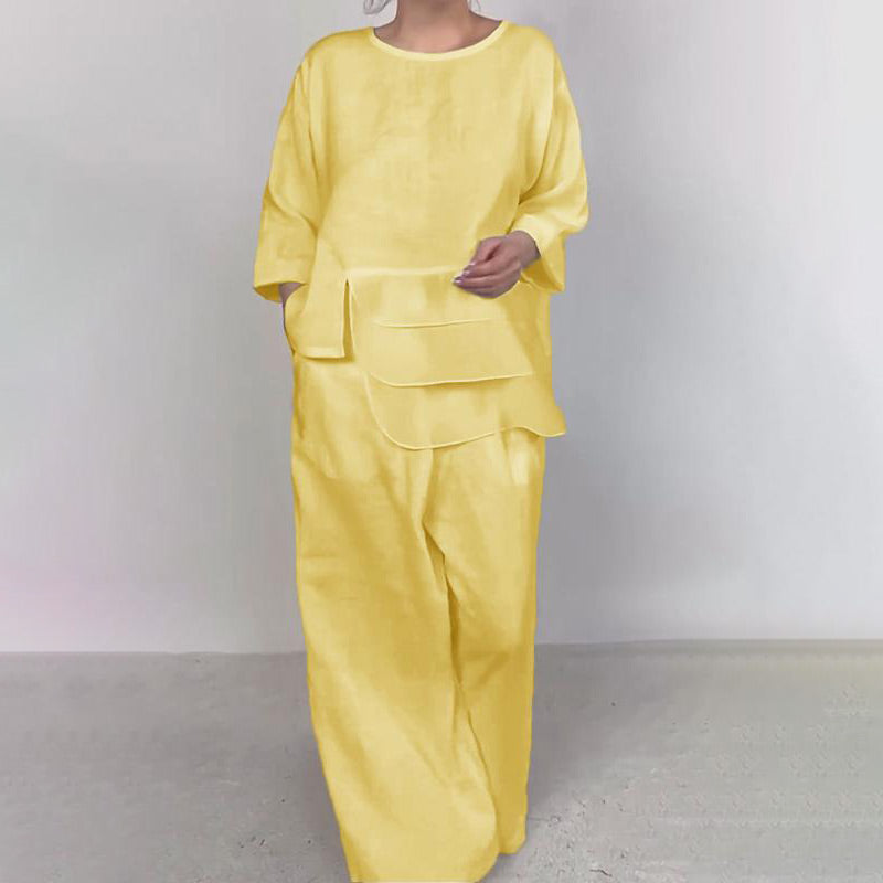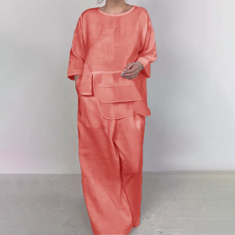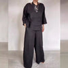 Confort la modă- Topul are un decolteu rotund elegant și detalii stratificate care îi conferă o notă de eleganță modernă. Pantalonii cu picioare drepte sunt largi, dar croiți pentru libertate de mișcare.
